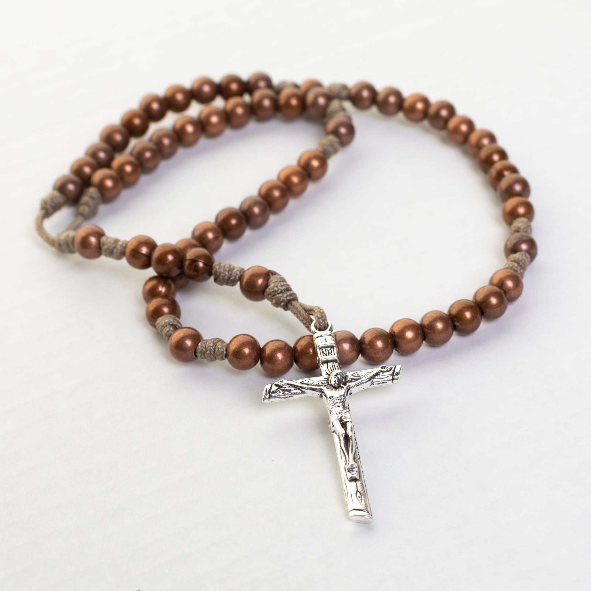 Bishop Sheen Rosaries are all made to be durable. They have a lifetime warranty and are made with paracord. Our metal beads are all tough, and give a nice heft to the Rosary, while our Olive Wood beads are imported from the Holy Land.